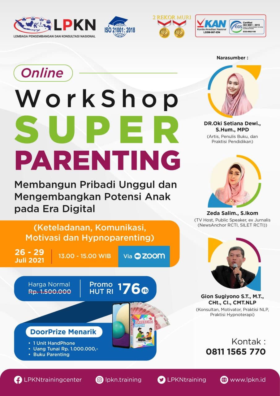 Pelatihan ini berbasis ilmu psikologi terapan, konseling dan hypnotherapy, membuka jalan kemudahan bagi para orang tua yang ingin menambah pengetahuan dan kompetensi di bidang pendidikan dan pengasuhan anak (parenting). workshop ini, telah banyak membantu orangtua dalam menghadapi dan mengatasi berbagai masalah sehubungan dengan anak-anak mereka. Cara-cara terbaik yang sudah terbukti hasilnya dalam penerapan cara mendidik anak, ada dalam pelatihan ini.